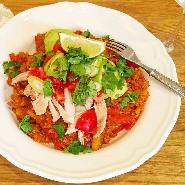 Mexická květáková rýže s kuřecím masem (Mexican Cauliflower Rice with Chicken) #whole30 #paleo #primal #paleosnadno #mexican #cauliflower #onion #garlic #tomato #bellpepper #avocado #springonion #chicken #cilantro #smokedpaprika #cumin #lime #eatclean #instafood #foodporn #prkýnko