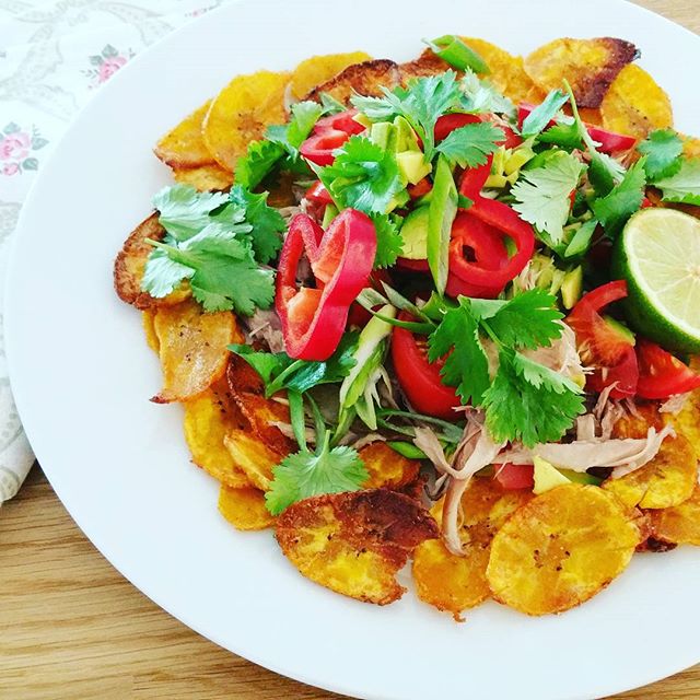 Nachos s plantainovými chipsy a trhaným krůtím masem (Nachos with Plantain Chips and Pulled Turkey) #whole30 #paleo #primal #paleosnadno #nachos #plantain #chips #pulledturkey #avocado #cilantro #tomatoes #bellpepper #lime #eatclean #instafood #foodporn #prkýnko
