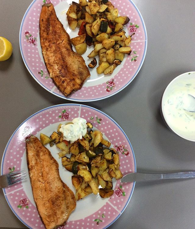 One of our "student quick & easy meals". Trout with spiced baked potatoes, courguettes, pepper + coriander garlic sourcream dip 👆👌. #trout #dip #coriander #potatoes #veg #baked #garlic #spiced #fish #studentlife #studentmeals #dinner #prkýnko