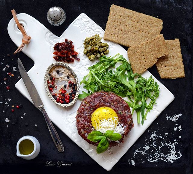 Tatarák nemusí být nutně jen ten klasický, ochucený do bezvědomí, že vůbec necítíte chuť masa 😉 Třeba takový italský se sušenými rajčaty a kapary, k tomu parmezánové krekry... Mňam! 😋👌(Italian Beef Tartare with Dried Tomatoes and Capers, Parmesan Crackers) #paleo #primal #paleosnadno #podlegrusovky #glutenfree #lowcarb #keto #prkýnko #tartare #beef #shallot #tomato #capers #parmesan #flaxseed #dnesjem