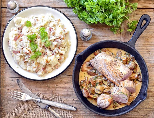 Když hladové krky čekají na oběd, není čas se aranžovat s fotkou 📷🍽️ Panenka v krémové žampiónové omáčce, šťouchaný květák se slaninou a cibulkou (Pork Tenderloin with Creamy Mushroom Sauce, Mashed Cauliflower with Bacon and Onion) #paleo #primal #paleosnadno #podlegrusovky #glutenfree #lowcarb #keto #prkýnko #pork #mushroom #cream #butter #parsley #cauliflower #bacon #onion