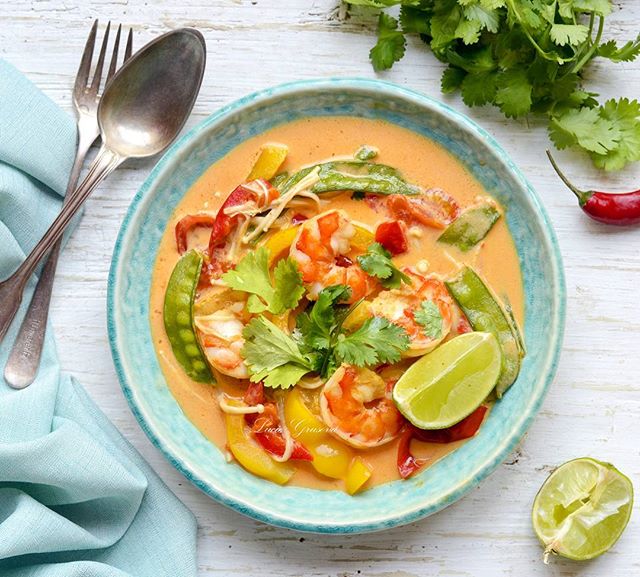 Uvařit tohle jídlo trvá kratší dobu než ho nafotit a sníst 👍📷🍽️ Takže, až budete chtít večeři do pár minut, určitě nezapomeňte na krevetové curry (Prawn Curry) #whole30 #paleo #primal #paleosnadno #podlegrusovky #glutenfree #dairyfree #lowcarb #keto #prkýnko #dnesjem #foodgallery_cz #curry #snowpea #bellpepper #tomato #redcurrypaste #coconutmilk #cilantro #lime #enokimushroom
