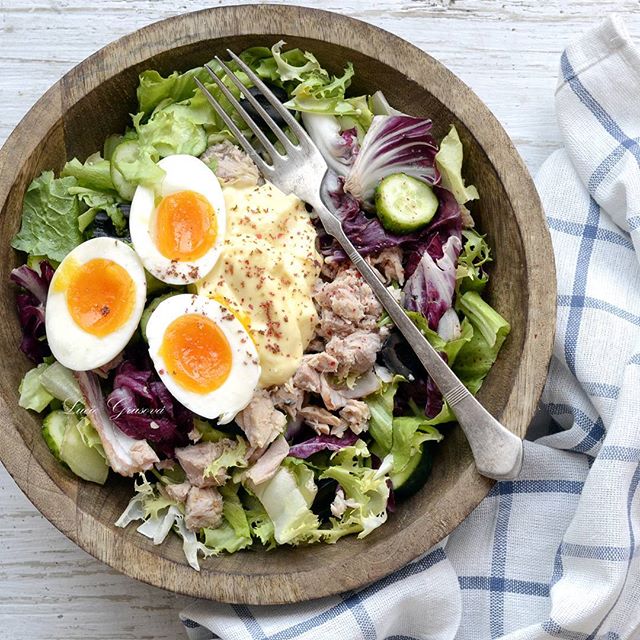 Tak na tohle jsem vážně moc těšila - až bude krásné počasí ☀️a člověk si opravdu s chutí dá zeleninový salát🥗. Já teda nevím jak vám, ale mně v zimě moc nechutnají 🙊 Salát s tuňákem a vejci nahniličko (Tuna Salad with Soft Boiled Eggs) #whole30 #paleo #paleosnadno #podlegrusovky #glutenfree #dairyfree #lowcarb #keto #prkýnko #lettuce #cucumber #olives #egg #tuna #mayonnaise