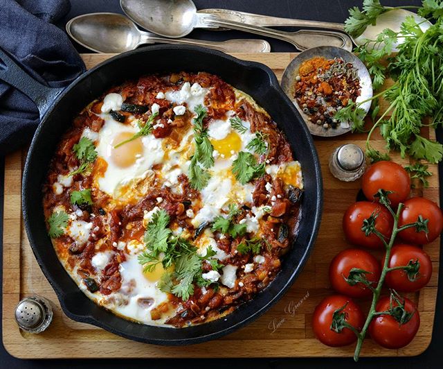 Příprava není nijak extra rychlá, ale za to ohromně jednoduchá. Pokud si chcete ulehčit práci, můžete si omáčku připravit dopředu a pak ji jen zapéct s vejci. Já dnes shakshuku vytunila různými zbytky z lednice, takže v ní najdete netradičně pórek, cuketu a feta sýr. Ale povedla se na výbornou! 😋❤️👌(Shakshuka with Feta Cheese) #paleo #primal #paleosnadno #podlegrusovky #glutenfree #lowcarb #keto #prkýnko #shakshuka #onion #garlic #leek #zucchini #tomato #cumin #smokedpaprika #egg #feta #cilantro