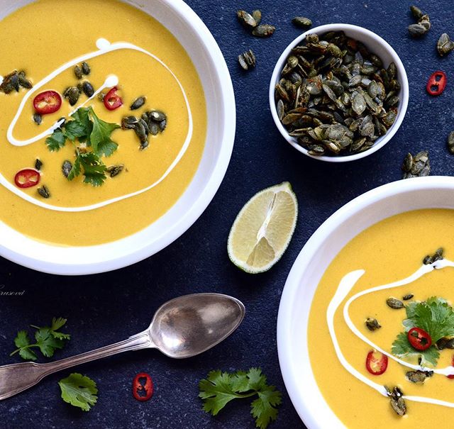 Pořád se o mě pokouší nějaký prevít bacil 😈 A čím ho nejlíp vypálit než nějakým pěkně pálivým jídlem 😉😋 Thajská cuketová polévka s křupavými pečenými dyňovými semínky (Thai Zucchini Soup with Crispy Roasted Pumpkin Seeds) #whole30 #paleo #paleosnadno #podlegrusovky #glutenfree #dairyfree #lowcarb #lchf #prkýnko #thai #zucchini #pumpkin #coconutmilk #redcurrypaste #lime #cilantro #eggwhite #pumpkinseeds