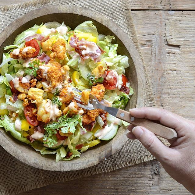 Včerejší "popcorn" jako doplnění bohatého zeleninového salátu. Aneb velký oběd téměř bez práce ☺️👍 (Vegetable Salad with Chicken & Cauliflower & Halloumi "Popcorn") #primal #paleosnadno #glutenfree #podlegrusovky #lchf #lowcarb #prkýnko #salad