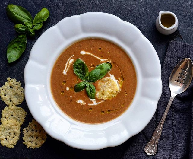 No neukecáme to - podzim je tady 🙈 Přichází na řadu polévky ❤️😋 Polévka z pečeného lilku a rajčat s parmezánovými chipsy (Roasted Eggplant & Tomato Soup with Parmesan Crisps) #primal #paleosnadno #glutenfree #podlegrusovky #lchf #lowcarb #prkýnko #eggplant #tomato #garlic #oliveoil #cream #parmesan #basil