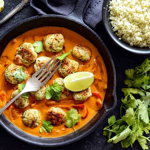 Krůtí kuličky v curry omáčce (Turkey Meatballs in Curry Sauce) #whole30 #paleo #paleosnadno #podlegrusovky #glutenfree #dairyfree #lowcarb #lchf #prkýnko #curry #thai #turkey #zucchini #garlic #ghee #bellpepper #leek #redcurrypaste #coconutmilk #lime #cilantro #cauliflower