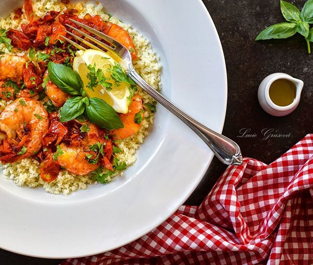 Jakmile se oteplilo, dostala jsem chuť na něco mořského ❤️🦐🌅 Krevety s pečenými rajčaty a květákovou rýží (Shrimp with Roasted Cherry Tomatoes and Cauliflower Rice) #whole30 #paleo #paleosnadno #podlegrusovky #glutenfree #dairyfree #lowcarb #lchf #prkýnko #shrimp #oliveoil #tomato #ghee #shallot #garlic #lemon #parsley #basil #cauliflower