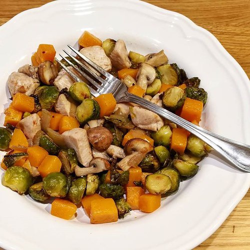 Den 22 jídlo 3 - může mi někdo vysvětlit, proč jsem prakticky celý život ignorovala kapustičky? Přitom je to taková dobrota 😋👍👌Kuřecí maso s žampióny, kapustičkami a dýní (Chicken with Mushrooms, Brussel Sprouts and Butternut Squash) #whole30 #paleo #paleosnadno #podlegrusovky #glutenfree #dairyfree #chicken #onion #mushroom #brusselssprouts #butternutsquash #eatclean #instafood #foodporn #prkýnko #jerf #dnesjem #dnesjim #foodblog