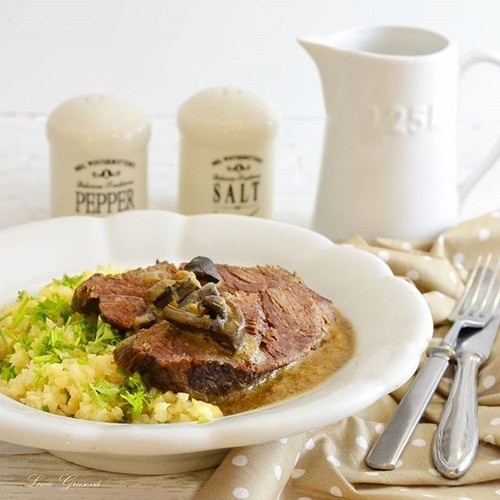 Den 27 jídlo 3 - nepovedená fotka 🙁 ale naprosto povedené jídlo 😉👌 Ten příbor byl úplně zbytečný, maso se dalo krájet lžící 👍😋 Hovězí na žampiónech z pomalého hrnce, celerová "rýže" (Slow Cooker Beef & Mushroom Stew, Celeriac "Rice") #whole30 #paleo #paleosnadno #podlegrusovky #glutenfree #dairyfree #slowcooker #stew #beef #mushroom #onion #caraway #celeriac #eatclean #instafood #foodporn #prkýnko #jerf #dnesjem #dnesjim #foodblog #cookbook