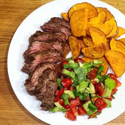 Skirt Steak, pečené batáty, avokádová salsa (Skirt Steak, Roasted Sweet Potatoes, Avocado Salsa) #whole30 #paleo #primal #paleosnadno #podlegrusovky #glutenfree #dairyfree #beef #steak #sweetpotato #avocado #chillipepper #tomato #bellpepper #lemon #cilantro #eatclean #instafood #foodporn #prkýnko #jerf #nebevhube #dnesjim #dnesjem #foodblog