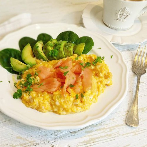 Míchaná vejce s uzeným lososem (Scrambled Eggs with Smoked Salmon) #whole30 #paleo #primal #paleosnadno #breakfast #goatghee #shallot #eggs #salmon #avocado #spinach #parsley #eatclean #instafood #foodporn #prkýnko #jerf