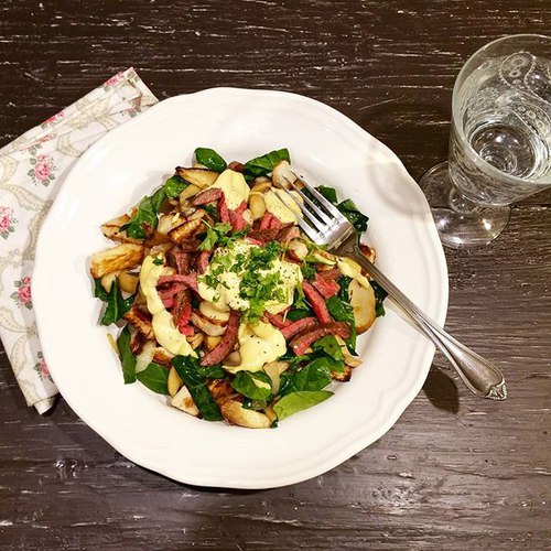 Hovězí nudličky z flank steaku, restované houby, pečený tuřín, hořčičná majonéza (Flank Steak Strips, Sauteed Mushrooms, Roasted Turnip, Mustard Mayonnaise) #whole30 #paleo #primal #paleosnadno #beef #flanksteak #turnip #mushrooms #babyspinach #shallot #mustard #mayonnaise #eatclean #instafood #foodporn #prkýnko #jerf