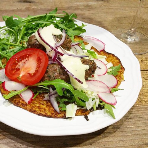 Jehněčí kebab v květákové placce (Lamb Kebab with Cauliflower "Pita") #whole30 #paleo #primal #paleosnadno #lamb #mint #cilantro #chillipepper #cauliflower #egg #arugula #radish #cabbage #onion #tomato #lemon #mayonnaise #eatclean #instafood #foodporn #prkýnko