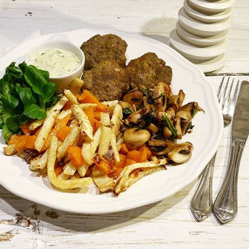 Pečené karbanátky v hořčici, restované žampióny, pečené celerové a dýňové hranolky, bylinková majonéza (Roasted Mustard Burgers, Sauteed Mushrooms, Roasted Celeriac and Butternut Squash Fries, Herb Mayonnaise) #whole30 #paleo #primal #paleosnadno #groundmeat #pork #beef #mustard #onion #garlic #mushroom #springonion #ghee #celeriac #butternutsquash #parsley #basil #mayonnaise #eatclean #instafood #foodporn #prkýnko #foodblog
