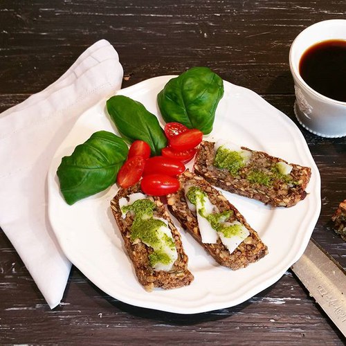 Semínkový chleba s kozím máslem a pestem z medvědího česneku (Nut Bread with Goat Butter and Wild Garlic Pesto) #primal #paleosnadno #glutenfree #eggfree #nutbread #goatbutter #wildgarlic #pesto #breakfast #eatclean #instafood #foodporn #prkýnko