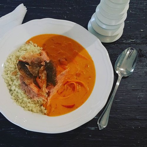 Rybí curry s květákovou rýží (Fish Curry with Cauliflower Rice) #whole30 #paleo #primal #paleosnadno #salmon #onion #garlic #bellpepper #carrot #currypaste #coconutmilk #cauliflower #eatclean #instafood #foodporn #prkýnko #curry