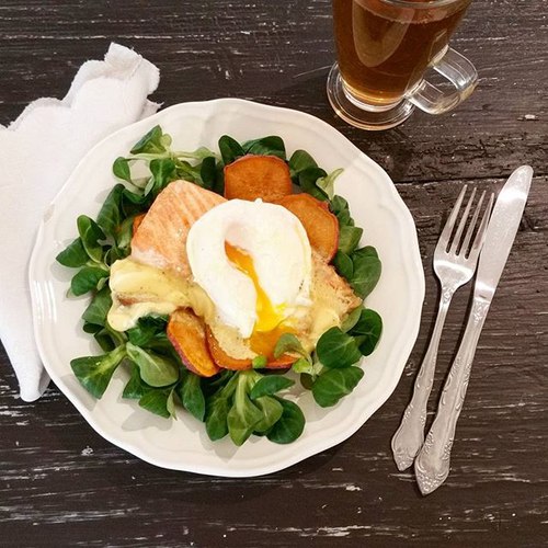 Pečený losos a batáty se ztraceným vejcem a holandskou omáčkou z ghee (Roasted Salmon and Sweet Potatoes, Poached Egg, Ghee Hollandaise Sauce) #whole30 #paleo #primal #paleosnadno #breakfast #salmon #sweetpotato #cornsalad #poachedegg #ghee #eggyolk #hollandaisesauce #eatclean #instafood #foodporn #prkýnko