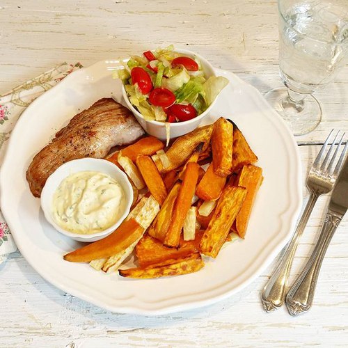 Vepřová panenka, pečené batáty a celer, domácí tatarská omáčka, zeleninový salát (Pork Tenderloin, Roasted Sweet Potatoes and Celeriac, Homemade Tartare Sauce, Vegetable Salad) #whole30 #paleo #primal #paleosnadno #pork #tenderloin #sweetpotato #celeriac #mayonnaise #shallot #mustard #parsley #eatclean #instafood #foodporn #prkýnko