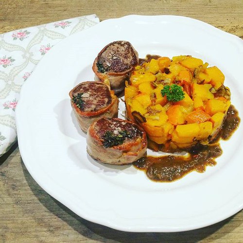 Srnčí medailonky v sušené šunce, dýně s houbami, švestková omáčka (Prosciutto Wrapped Venison Medallions, Pumpkin with Wild Mushrooms, Plum Sauce) #whole30 #paleo #primal #paleosnadno #bestever #venison #thyme #prosciutto #pumpkin #wildmushrooms #pumpkin #eatclean #instafood #foodporn #prkýnko