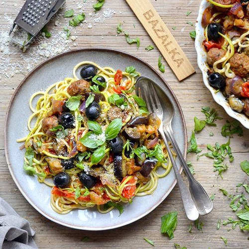 Pokud si chcete co nejvíc zjednodušit vaření, využívejte hodně troubu. Zatímco ona pracuje, vy můžete dělat něco úplně jiného. Třeba si skočit do vany 👙🐳😂 Pečené masové kuličky s lilkem, rajčaty a olivami, cuketové špagety (Roasted Meatballs, Eggplant, Tomatoes and Olives with Zucchini Noodles) #paleo #primal #paleosnadno #podlegrusovky #glutenfree #lowcarb #keto #prkýnko #dnesjem #foodgallery_cz #zucchini #eggplant #garlic #tomato #olives #oliveoil #thyme #basil #parmesan