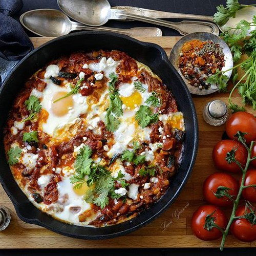 Příprava není nijak extra rychlá, ale za to ohromně jednoduchá. Pokud si chcete ulehčit práci, můžete si omáčku připravit dopředu a pak ji jen zapéct s vejci. Já dnes shakshuku vytunila různými zbytky z lednice, takže v ní najdete netradičně pórek, cuketu a feta sýr. Ale povedla se na výbornou! 😋❤️👌(Shakshuka with Feta Cheese) #paleo #primal #paleosnadno #podlegrusovky #glutenfree #lowcarb #keto #prkýnko #shakshuka #onion #garlic #leek #zucchini #tomato #cumin #smokedpaprika #egg #feta #cilantro