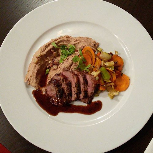 Podhůrske podzimní menu - Kachní prso s vinnou redukci, restovana podzimni zelenina (rapikaty celer, mrkev, porek, cibule) a kastanove pyré. #podzimprichazi #cosklidimetosnime #prkýnko