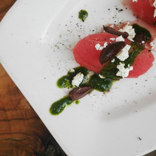 Staré chutě, nová skupenství. Třetí, nebo už dokonce čtvrtá sezóna melounového salátu si žádá inovaci. Melounový sorbet, emulze z bazalky a olivového oleje, trochy Maldon soli a citronu, k tomu kozí feta ze Skryjí a řecké černé olivy. Něco mezi salátem a dezertem. #carovnymlyn #zmlynskekuchyne #prkynko